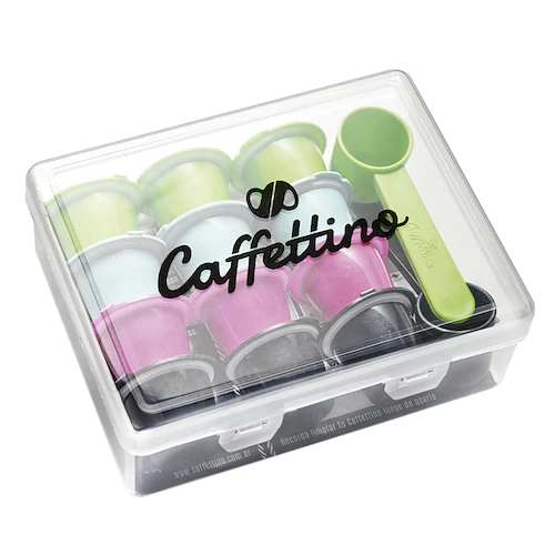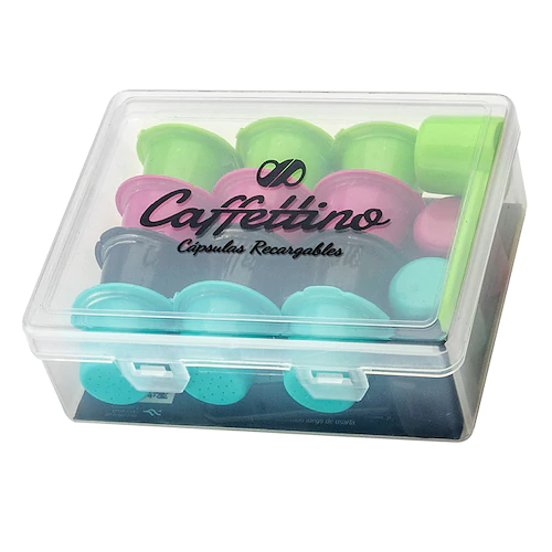 Cápsulas Caffettino Recargables NESPRESSO x12u: café alternativo con onda Olvidate de las cápsulas tradicionales: estas cápsulas recargables permiten usar tu café favorito con un diseño que deja entrar el agua sin perforar la máquina. El agua se mezcla y circula uniformemente, exprimiendo todo el aroma y cuerpo hasta la última gota. ¡Dale vida a tu Nespresso y convertite en barista en casa con estas cápsulas revolucionarias y reusables!